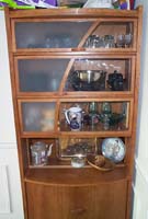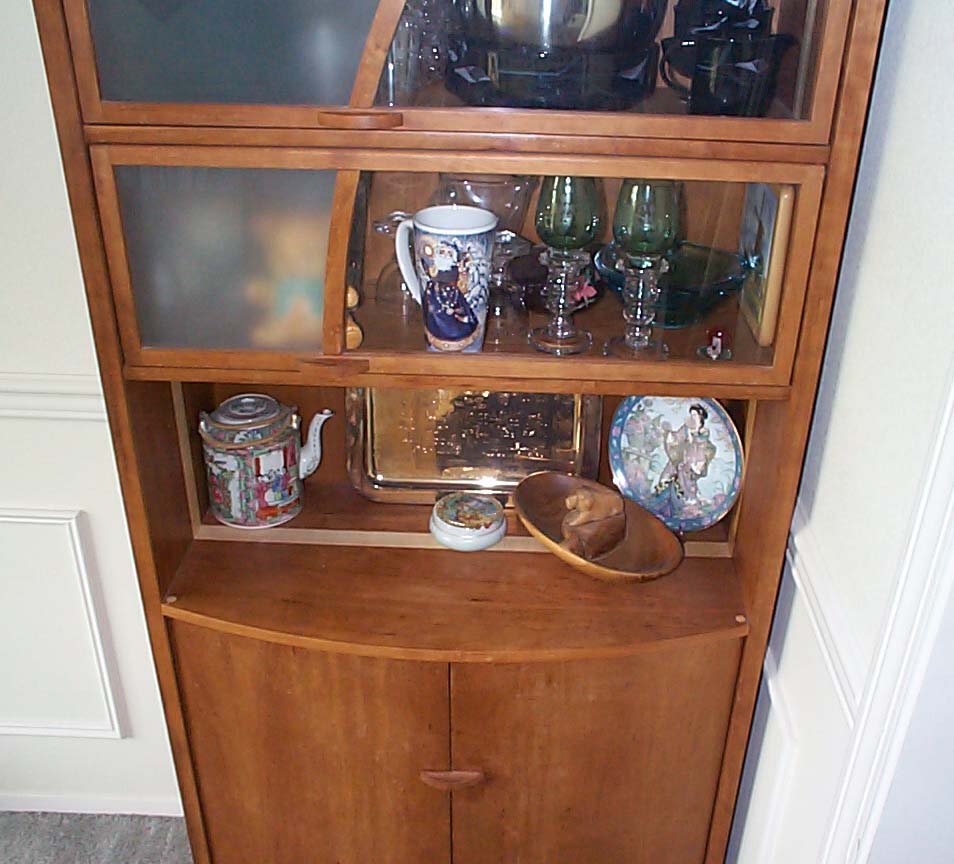 So, furniture studio meant starting on paper and with ideas bantered about. While paper designing, you make scale models with cardboard. Sooner or later, you come to a design you want to build. The next step is a full size mock up with particle board to work out assembly and other design issues. Finally, you go get the REAL wood, and painstakingly build your design and hope for the best. I had a few glitches, such as the widest pieces of cherry were not wide enough for my cabinet sides and shelves. To fix this, I opted for an "accent" in the maple strip you see running through center of the sides and shelves. I also had a big SNAFU when during final assembly (lots of glue and tight joints which do NOT come apart after you get them together) I noticed that I had put the main shelf (the one on the TOP of the cabinet doors below) UPSIDE DOWN! The shelf was pre-drilled for the hinge pins of the doors! DOH! So, after crying and soul searching, I ended up doing another "accent" of maple to fill those holes, and drill through for the new holes. Anyway, it all came together, and I applied a (half-assed) french laquer finish. Unfortunately, while transporting from studio to home, it got rained on, giving me a water spotted half-assed french laquer finish. ;-)