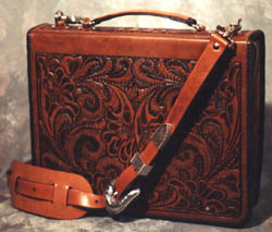 ![]() Other Pics of this piece: Trigger Snap and Handle Detail Tooling and Buckle Detail Zipper End Detail Exterior of open Case Interior of open Case Pockets on inside front Detail of Pockets, unfastened Handle Detail |