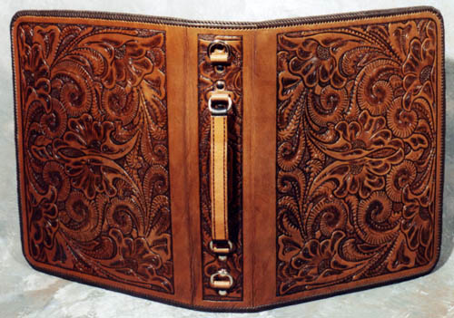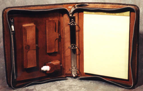 Writer's BriefcaseAs of October, 1998, this was my most difficult (i.e. biggest learning experience) project yet. Not only did I have to do a whole mess of project design, figuring out how the pockets should work, I had a lot of construction techniques to learn. This description will simply not suffice, no matter how good it is. If you aren't looking at the pictures, go look at them. They'll tell you pretty much everything you need to know.A couple things worthy of making note of: The small pockets on the inside front are held shut with button studs on the "bottom" of the pockets. This was to save/allow as much room as possible for the notepad and anything on the binder. With regular snaps, the pockets would have been an additional 1/4" or more thick. With tuck-in flaps, they might have come open. Everything is HAND done. Even the stitching of the zipper to the gusset is hand stitching. Lacing, of couse, is by hand (about 25 YARDS of the stuff!). And all the tooling (the most I've ever done on a single project) is all hand done, from a modified pattern in an old leathercraft manual I found in a used bookstore. Easily one of my proudest achievements to date, but there's a ton of things I'll do better next time! ;-) This case measures approximately 11"x14"x3". Price: $1,000+ (YES, that's correct) |