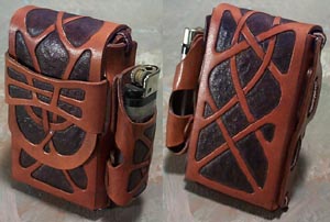 Cigarrette CaseSimilar in construction to the other case, this one sports an original design by me inspired by the Leather Art of Joe Barth. Also long enough to hold exta-long cigarrettes, and flexible enough to slap against your palm, this case will never let you down. With the lighter caddy.Price: $40+ |
