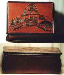 Leather BoxI believe the artist that made this box is Martin Steinbock of "Martin Leather Design". It is a relatively simple design, but in this case, I like the simplicity of it. He uses tooling leather and traces his design to be cut with the swivle knife. He does not tool the piece, but wet brushes the accents on. The corners of this box bow out a little, and it is constructed with waxed thread at the corners. The top is held on by it's snugness in the sides of the box. |