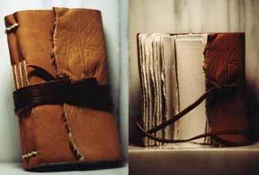 "Iona" handcrafted bookI found this book at a store called "Fireworks" that used to be a great store for artists. Iona can also be found at major festivlas in the Northwest. Last time I saw them was at the Renaissance Fair in Kent, WA last summer. They also are regular at the Portland saturday market. They take handmade paper, and hand-bind it into oil-tanned leather. If you're interested in their work, give them a call at 1-877-IONA-BKS. |