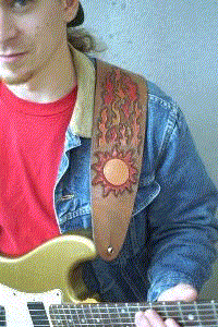 Flaming Guitar strapThis guitar strap was one I made for a friend of mine. He wanted something cool and impressive, well I think he got it, and he told me so. The flame style is an original design and the sun image was garnered from a clip-art gallery. Isn't it cool how the flames seem to climb up?Price: $100+ |