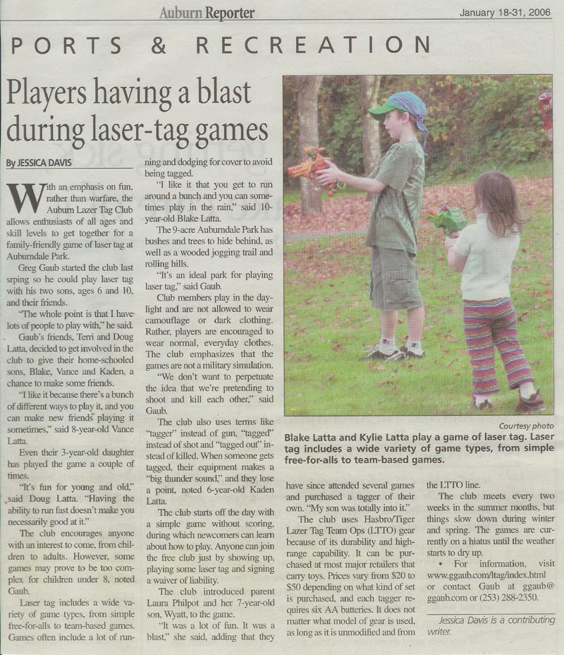 | Greg is the founder of the ALTC. He's been an Auburn resident for more than 20 years, and has had a love for outdoor laser tag gaming since he was a teenager. Read Greg's Story to find out why and how he started the ALTC. | After searching for many years, Tod has finally discovered a sport that is light on the dexterity and heavy on the fun. He has been an Auburn resident for 16 years now, but since he lives on the same block that his father grew up on, he considers himself a native. |