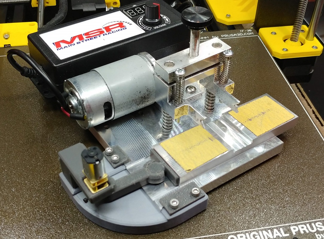 The G&S Tire Grinder is designed to be as versatile as possible. Standard 1/32 axle bushings snap into the axle bracket, while larger or smaller bushings will rest in the upper or lower v-goove. While this is designed as a beginner machine for whole axles with pressed on plastic wheels, it also works well for performance axles and metal wheels, allowing you to true one or two at a time. The sanding spindle can be easily adjusted for parallel (tramming) to the axle bracket, and spare plastic parts are included for those that are expected to wear over time, such as split pulleys (for both 3/32 and 3mm axles), motor drive pulley, and the axle bracket. Models for all parts are available for free online, and so can be printed by any 3d printer as needed.