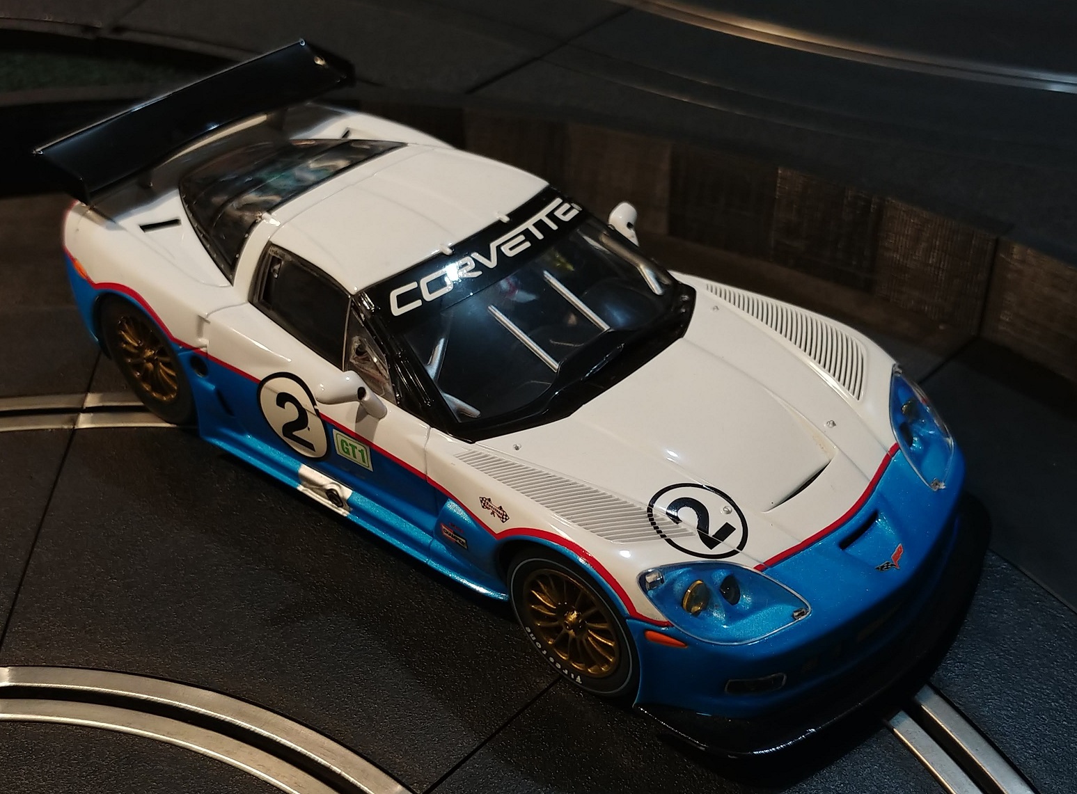 Exclusiv Corvette C6R Spirit of '65 - Good condition. This one has seen the track but doesn't look any worse for it. All the small parts are there, both mirrors and the wing. No visible paint damage, though there is a spot in the driver side running board that looks like a soldering iron got too close. Magnets have been removed, and the rear tires have been replaced with Paul Gage urethane tires. A D124 chip has been installed. No case, of course.