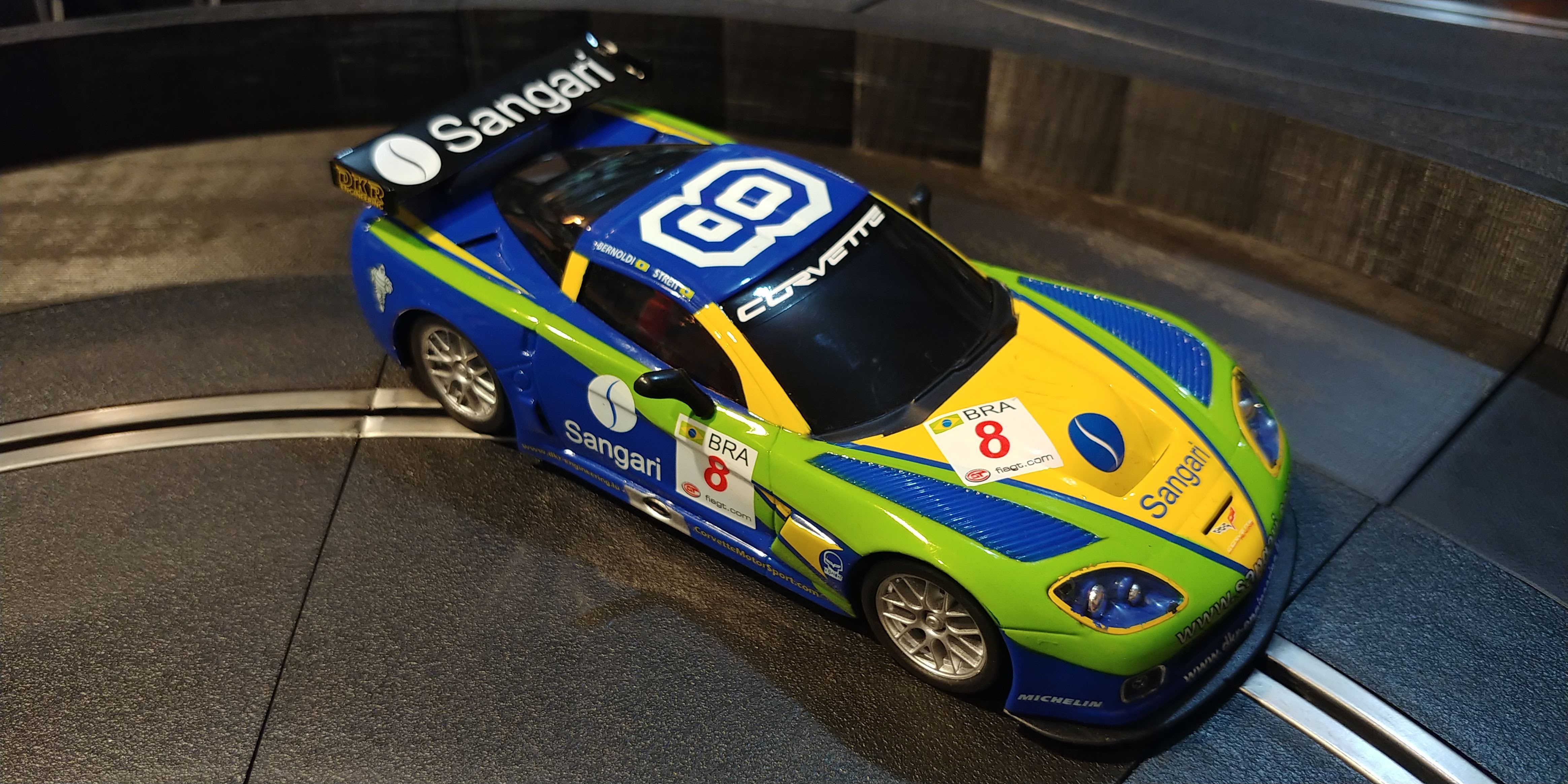 Ninco-1 Corvette Z06 GT3 - Sangari - Great condition. This is a "high impact" car, with smoked windows and no interior, meant for kids. Some wear on tires and braids from occasional track time. No damage. Inline motor configuration, both gears still good. Traction magnet removed.