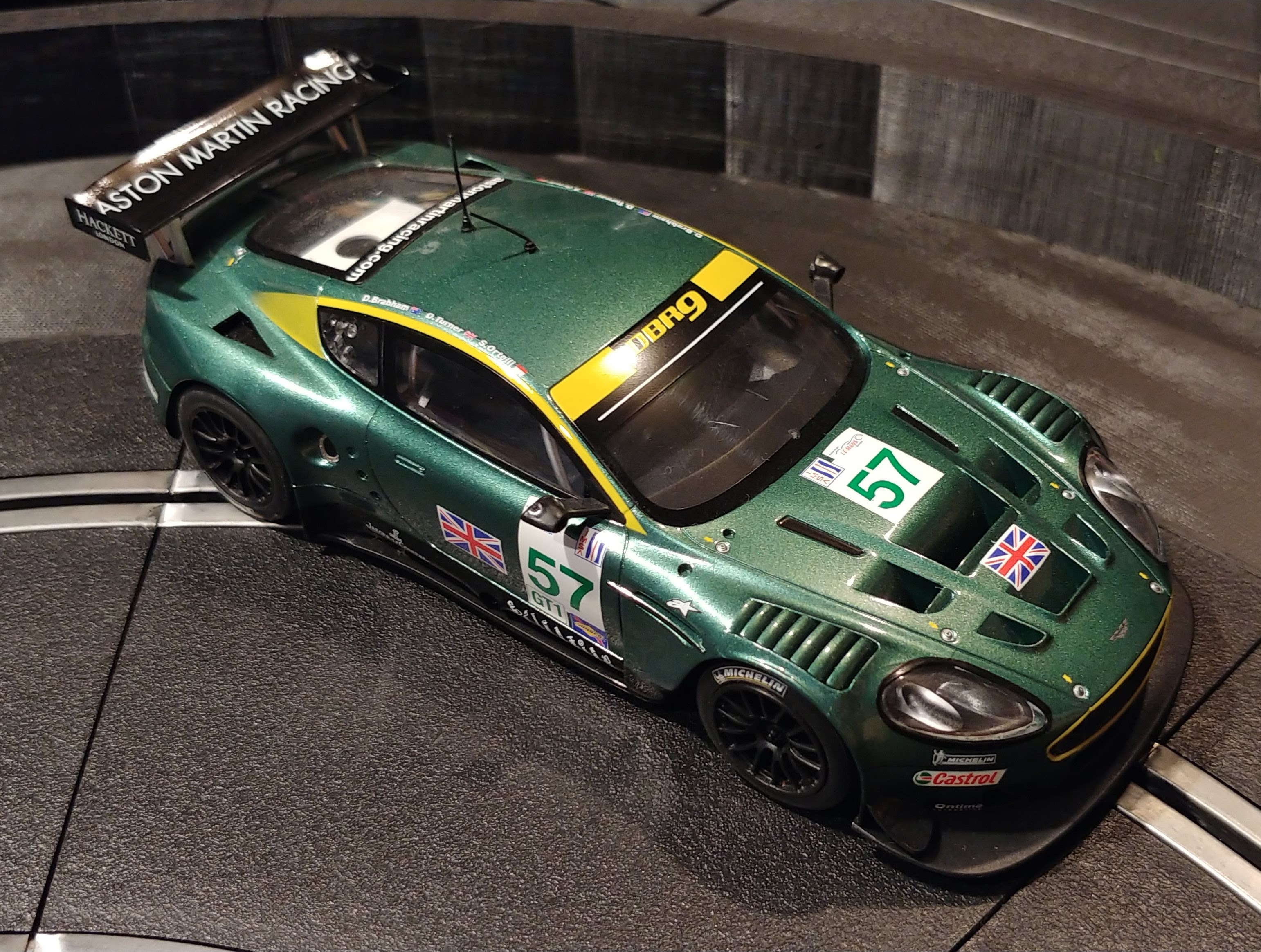 Aston Martin DBR9 - Excellent condition. High detail car, with full interior, front and rear lights, digital ready for C7006 Saloon SSD chip (not included). Parade laps only, no wear. No damage. Sidewinder motor configuration, both gears still good. Traction magnet removed.