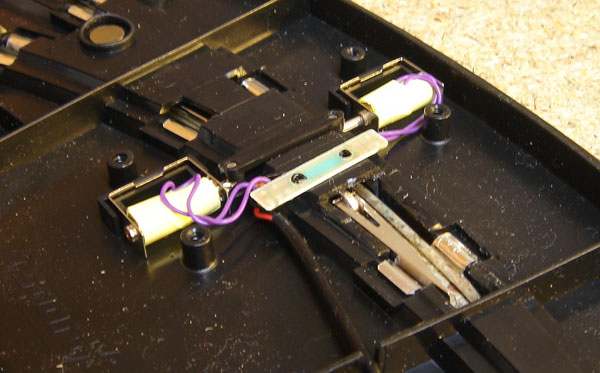 The procedure itself is fairly simple. Open up the panel on the bottom of the lane changer and set the screws and panel aside. Use your craft knife to cut away some of the plastic under the flipper, nearest the tip. Keep cutting, being very careful not to cut the electronics, until you uncover the cavity in the flipper itself. Check out this picture to see what I mean.