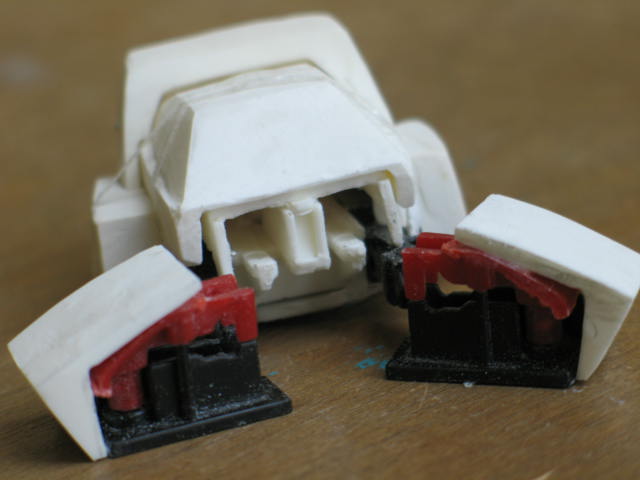 I figured people wouldn't like a minibot without wheels, so I kept them on the Cliffjumper kitbash, but Greg felt it would be better to go all the way and cover up the toy's wheels or eliminate them all together to be more faithful to the vehicle mode as it was depicted in the cartoon. At that point I began realizing it would be better to totally replace all of the body panels with parts of my own design.