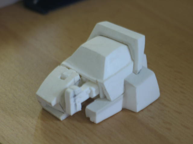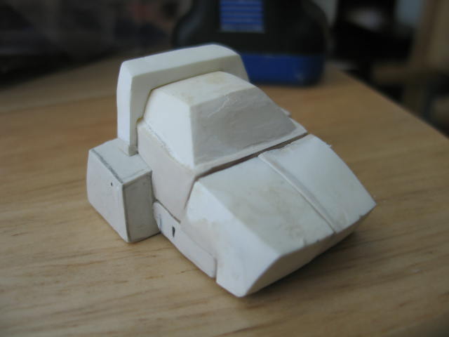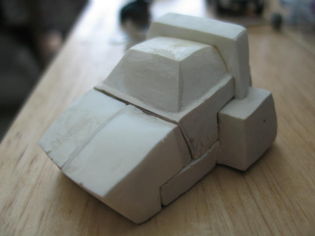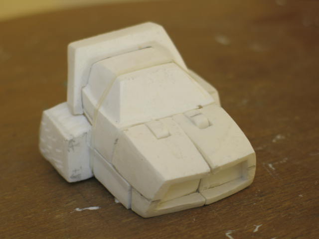 I started thinking that just changing out the feet and head wouldn't really do justice to the idea. So the idea evolved and I began designing an entirely new outer body shell that would fit on an existing minibot chassis. I liked that idea a lot. If I could pull that off I'd be able to create all sorts of new minibots without having to engineer my own transforms. I went back to the drawing board and came up with a bunch of drawings of proposed looks for the new outer body. They varied slightly in the slope of the hood and other tiny details. I emailed them to the guys and we all agreed on on which shape we liked . I got busy sculpting the first prototype out of clay based on the design we all liked best.