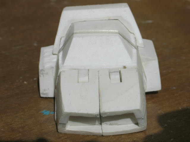 Click on the thumbnails above to get larger pictures. You can see how I was experimenting with the shape of the quarter panels and other features. You can also see how the feet at this point were just shells that fit over the existing feet. At this point I was still designing the feet so that they would use the same transform as the toy. That would eventually prove to be too difficult to duplicate in resin. The plastic used in toy manufacturing is pretty strong even at very thin thicknesses. The resin I used was never meant for making transforming figures. So I eventually scrapped that idea and redesigned the feet so the resin wouldn't break during transformation.