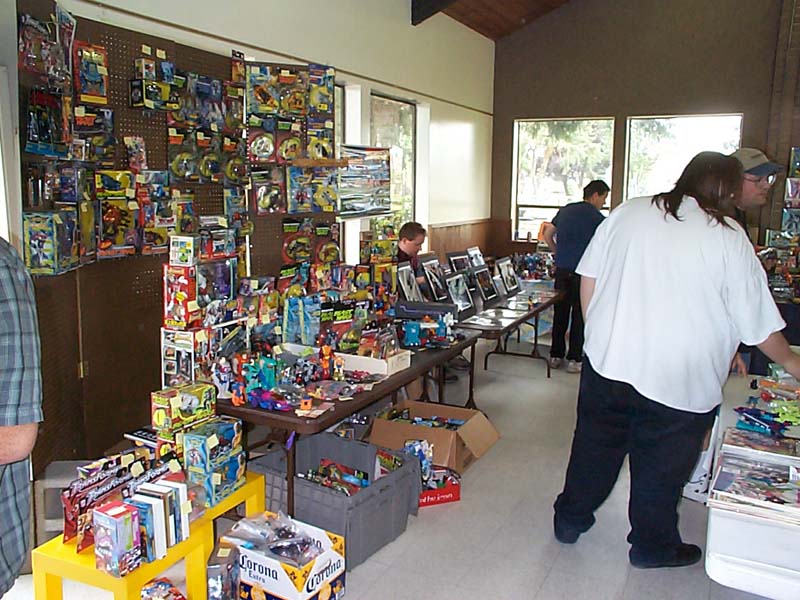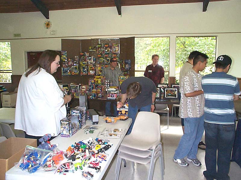 Well, the day has come and gone. Reports have been written, and the cat has forgotten what the inside of the bag even looks like. But hey, I took pictures, and I took video (with Richard's generous assistance), so I figure I might as well tell my story, if only to toss in one more perspective, as an organizer, attendee, and oft-times ringmaster. For my part, aside from being the numb-skull that said "Hey, how's about everyone in the area come hang out with me for a day?" 5 years ago, I contributed where I could. Starting with the reservation of the building 6 months ago, through all the "Yeah! let's do that!" replies to Richard's communications with crazysteve about the exclusive toys, the endless requests for Richard to tweak this and that on every inch of every panel of the box designs to suit my perfectionist artistic eye, which he begrudgingly yet skillfully made happen with his Photoshop magic, the over 50 photo-quality prints my printer churned out for me to carefully (perfectionist, remember?) trim out, fold up, and encase 45 toys in, my work truly encompassed only a small portion of it all. Zobovor has detailed his beautiful work on the character art, battle scene, and instruction booklet. Crazysteve has detailed his mind-boggling work on the breathtaking custom Bumblebee toy. Richard has glossed over the work he did on the box design somewhat... when I said endless requests for tweaking the design, I wasn't kidding... he probably won't do a box with my knowledge again. ;-) All that work came seamlessly together to be one of the most memorable Transformers conventions for all that attended, and possibly the best CybCon for a very long time to come. So what was it like on the day of? Well, I can only tell my side, so here we go. Who can sleep well the night before a big meeting they're hosting? Well, not me anyway. I packed most everything the night before so that I wouldn't need to get up too early. Even though I set an early alarm to make sure I was ready to go and there on time, I was wide awake hours before my alarm was set to go off. I figure I might as well get up and get ready, if only so I wasn't feeling like I was in a rush. I had planned to be there at 8:30, half an hour before the dealers were to begin setting up, but even with stopping for doughnuts and bags of ice, I was there at about 8:15. Not at all surprisingly, there were already a few people there. If my feeble memory doesn't fail me, there were about 6 people there, 2 or 3 were dealers. I opened the building and took a quick look around to form a plan of action. It didn't take long for more people to show up, dealers and attendees alike. I put up an "arrival order" sheet for people to sign when they arrive, rather than making people (including dealers) stand in line the entire time. The early dealers helped me set up the (fortunately) numerous included tables into an island and tables around the perimeter for the other dealers to occupy. Fortunately, we didn't need many more tables, and the empty spots there were were promptly filled. Every dealer had a spot, and we even had a small area left over (more on that later). With all the tables in place, dealers could pick their spot and start setting up. Richard and his lovely wife, Zeatha, who was an indispensible helper for the entire time, arrived shortly after and helped with setting things up and bringing things in. Joebot arrived a little late this year due to an unfortunate fight with food poisoning, so several of us helped him bring his stuff into the room so he could set up a little faster. Richard set up a table with my old 10 gallon fish tank turned over on top of a tiered shelf showing off past CybCon toys, this years toys and prototypes, as well as some other rare and delicate items, including my BotCon 2004 breakfast exclusive Breakdown. He also set out some of his newer TFs like Shockblast, Cliffjumper, Binaltech Hound, and test-shot Towline. I set up my tables blocking off the kitchen area and put on them my TV and PS2 for video games (starting with the PS2 Transformers game for people to play with), the raffle and auction items, and the sign up sheets for the Trivia and Beast Wars Transmetals game tournament. This was also the ill chosen setup for delivering pizza to hungry people at lunch time.... but I'll talk about that later. :\ Shortly before 10am I announced to the dealers that they needed to go get in line if they wanted an exclusive. The sign in sheet had done its work, and the dealers were able to take their place according to their arrival time. I made sure everyone was lined up, and that anyone who didn't register was waiting at the end of the line. Such is their punishment! hehe. Anyway, I opened the doors promptly at 10, and Zeatha was immediately put to work. To speed things up, and because I was an idiot who forgot to get change for the people who inevitably had only 20s and 50s so people ended up buying a ton of raffle tickets (price reduced to 2 tickets for a dollar!), Richard came over to help her pass out the toys as they were sold, and to count off raffle tickets. Fortunately, another dealer has a few bucks in change to help us along, but I think most people decided to go ahead and get their "change" in raffle tickets anyway. I kept an eye on Joebot's table, which was still being set up, as he was in line for a little longer than the other dealers. It didn't take long for things to be in full swing, with the building, effectively the dealer room, being full of busy collectors looking for their next deal. It was also not long before everyone waiting outside came in and decided to buy toys or not. What surprised me was that there were actually TWO Bumblebee toys left over! I took the opportunity to do what we had originally planned to snag them for auction and raffle. As I approached Zeatha at the sign-in table, someone came up to buy one of them, so I only got one, and decided to put it with the Auction items. 11am rolled around, 