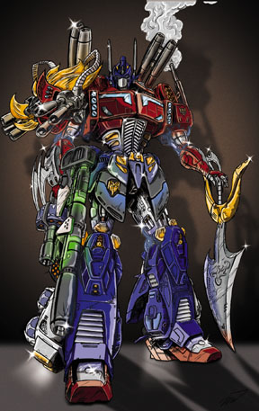 - Ultra Optimus - Commisioned art. Ultra Op is an amalgum of Star Saber, PowerMaster Optimus Prime, and Leo Convoy (BWII). Instead of two tires on each leg, he's got extra grenade drums for his rifle! }-> (112k, 9-26-00)