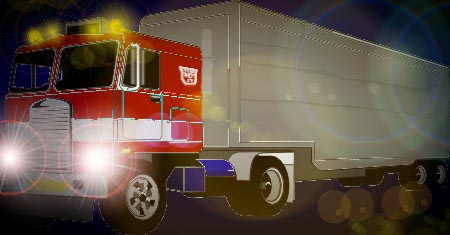 - "Late shift" - Optimus Prime in veichle mode at night. did this one as an excuse to fool around with the fx on corel photoshop. (27k, 9-26-00)