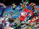 These are scans of the cool battle scenes that appeared on the back of toy boxes through most of the original TF series. Although the US toys stopped including these scenes with the start of Generation 2, Japan continued the tradition. I wish I had more than the one from Japan, though. Also, these are not ALL the scenes ever produced, just a few of them. Most are presented at 1024x764 pixels when possible, making for neat desktop "wallpaper" images.