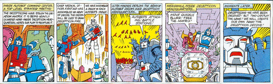 • Page One (185k) - The comic strip side, depicting the creation and use of the Autobot Decoys.