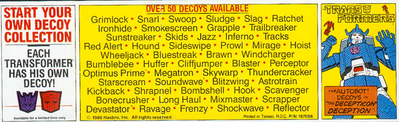This is the tiny little flyer that promoted the existence of the Decoys that came with the Minibots during one of the promotional things, similar to the "minispies" promotion. Basically, it's a little comics strip that makes you want them all, and a list of all the ones to try to collect. Approximate dimensions are 2" by 6-3/8"