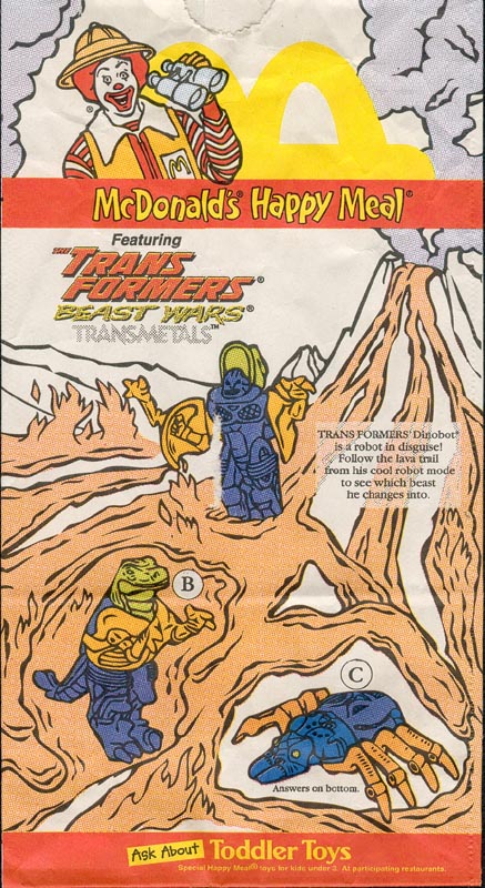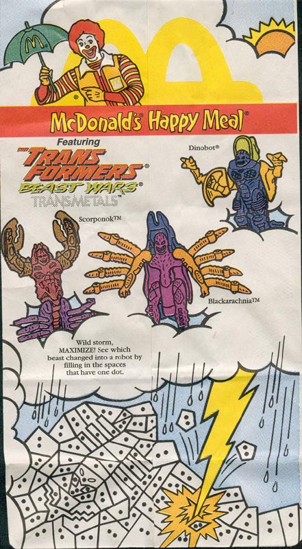 This is the second Beast Wars McDonald's promotion, promoting the Beast Wars Transmetals toys, which took place in 1998. Instead of boxes, this time we got bags. :( The co-promotion was "My Little Pony" which was on the back of the bags. One side of each bag had coupons for either toy line, and the other side had an extension of one of the "activities."