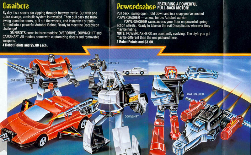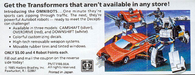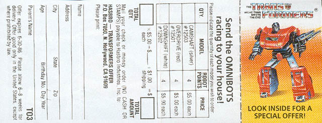 Similar to the Reflector flyer, this one promotes only the Omnibots: Camshaft, Overdrive, and Downshit. Also with description and order form. Approximate dimensions are 2" by 5"