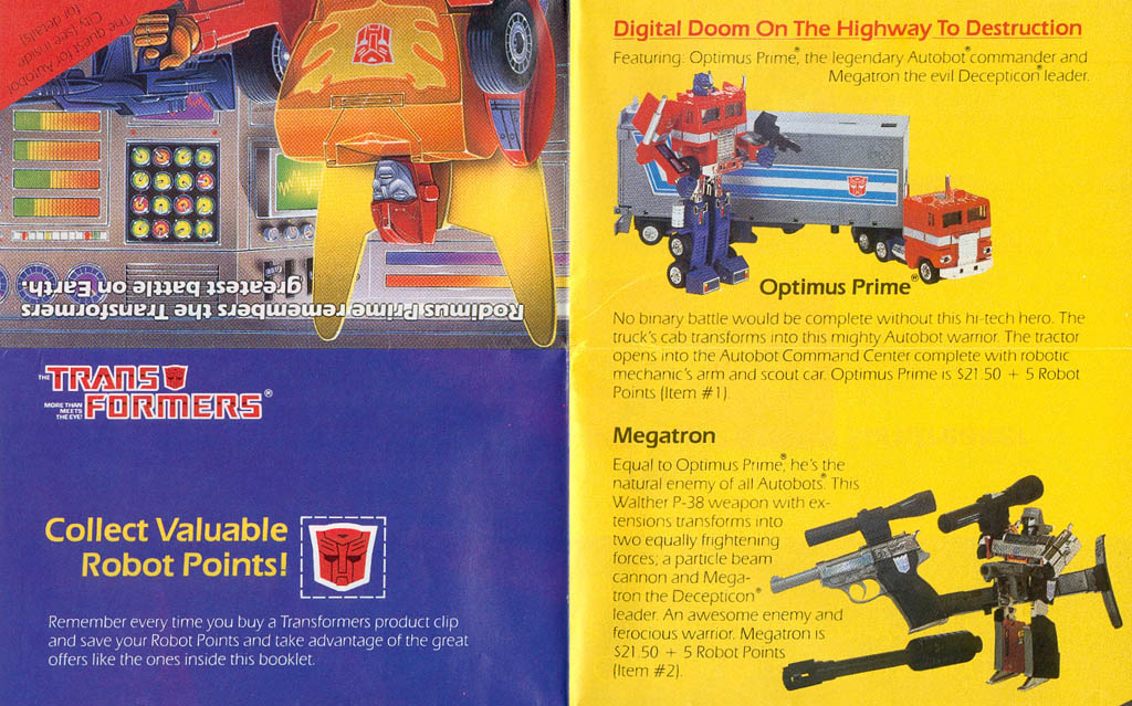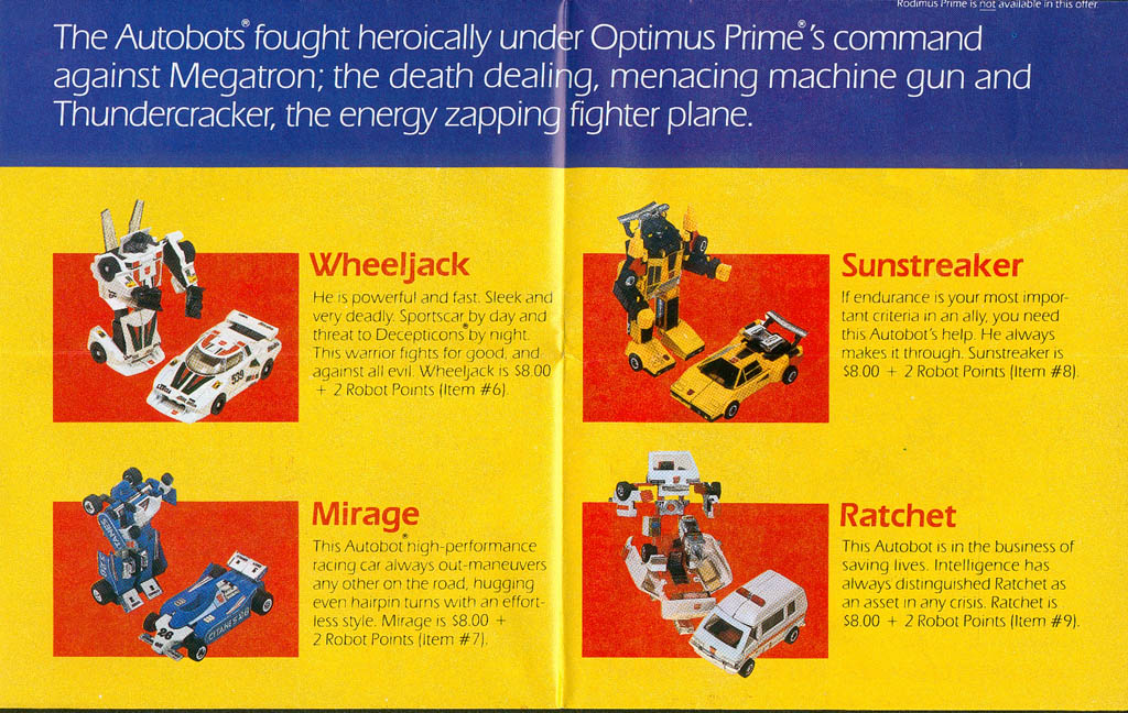 The pages of this flyer aren't really numbered, so I'm just kind of guessing. Approximate dimensions of each page are 11" by 7". This happens to be the promotion that I got my Thundercracker, Reflector, Wheeljack, and Cosmos toys from. I also got Ratchet, which I later traded, and I tried to get Optimus and Megatron, but they were out of stock.