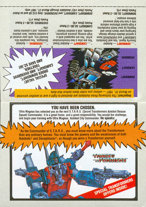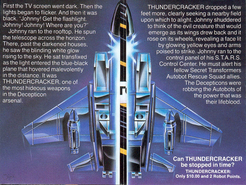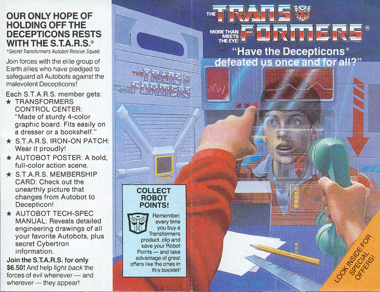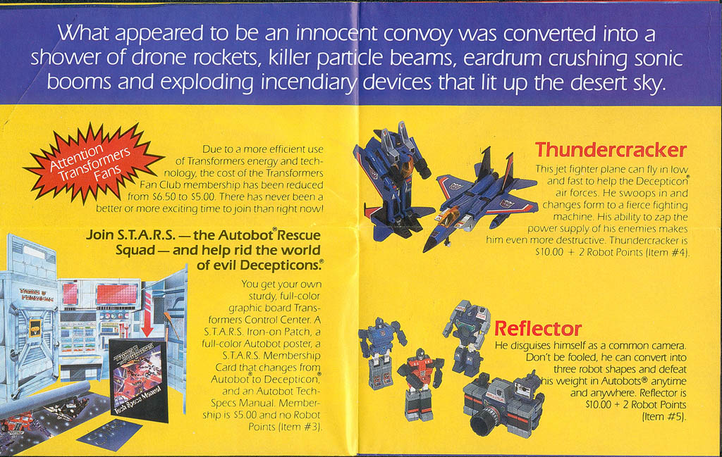 • Page Three (213k) - some text of the "story" in this flyer, plus pics and descriptions of Thundercracker, Reflector, and the S.T.A.R.S. club.