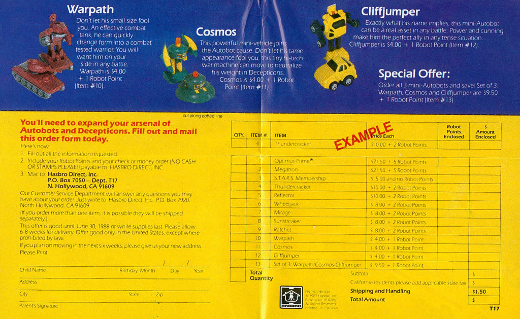 • Page Six (187k) - pics and descriptions of Warpath, Cosmos, and a yellow Cliffjumper, as well as the order form for the offers.