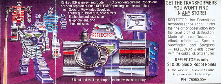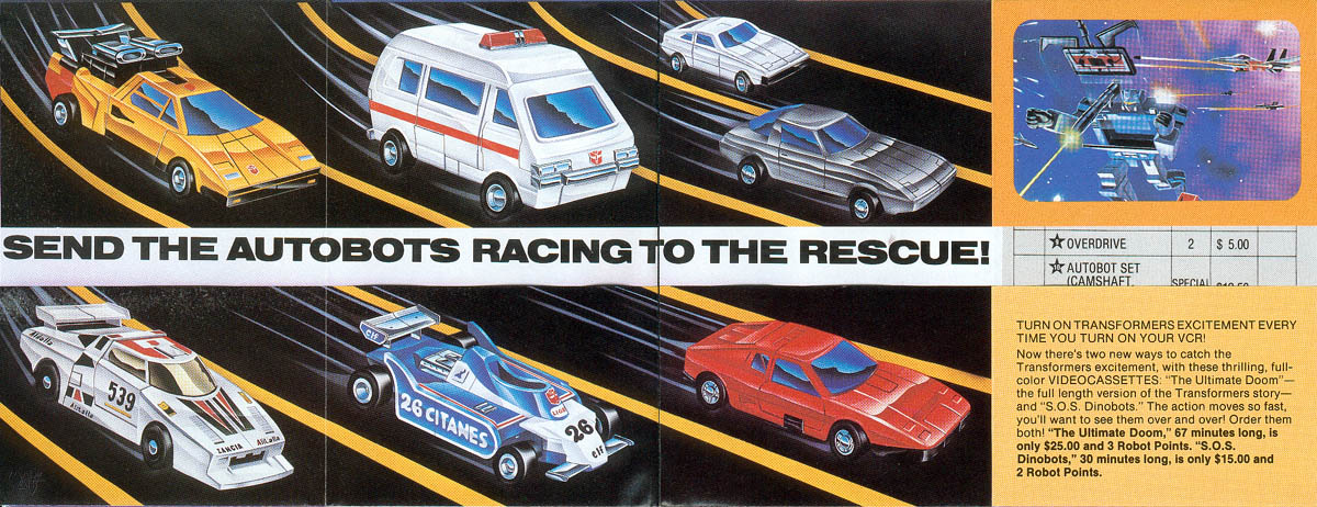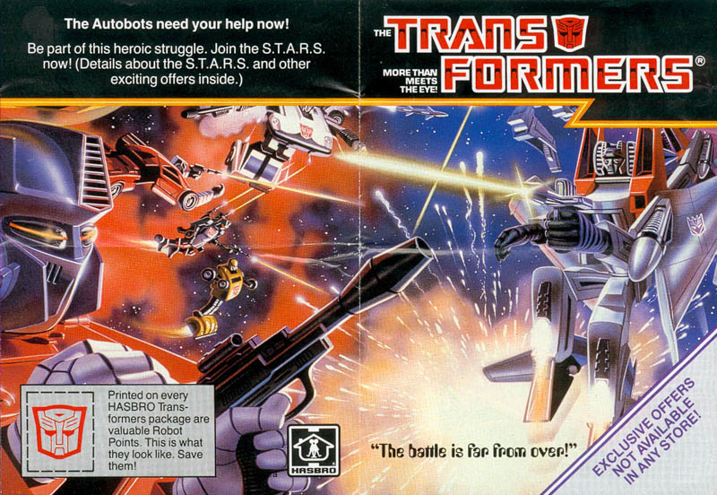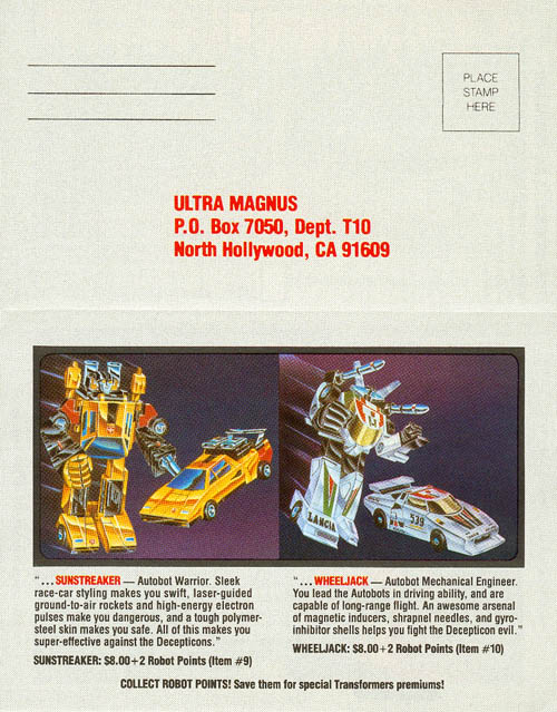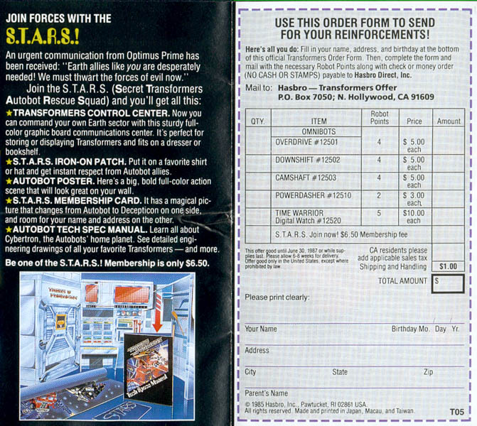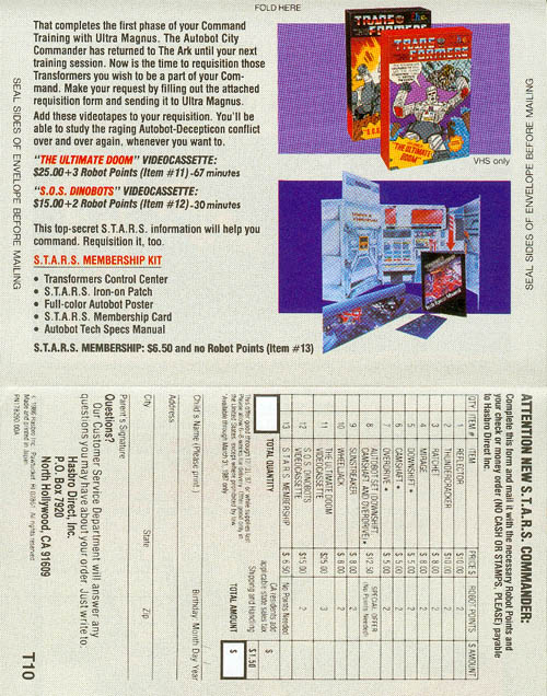 This one sells the STARS club, as well as the Omnibots, Sunstreaker, Wheeljack, Reflector, Thundercracker, Ratchet, and Mirage, as well as a couple TF video tapes. Approximate dimensions are 5-1/2" by 15" when fully opened.