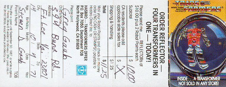• Page Three (96k) - The back of the order form, and Sunstreaker and Wheeljack info.