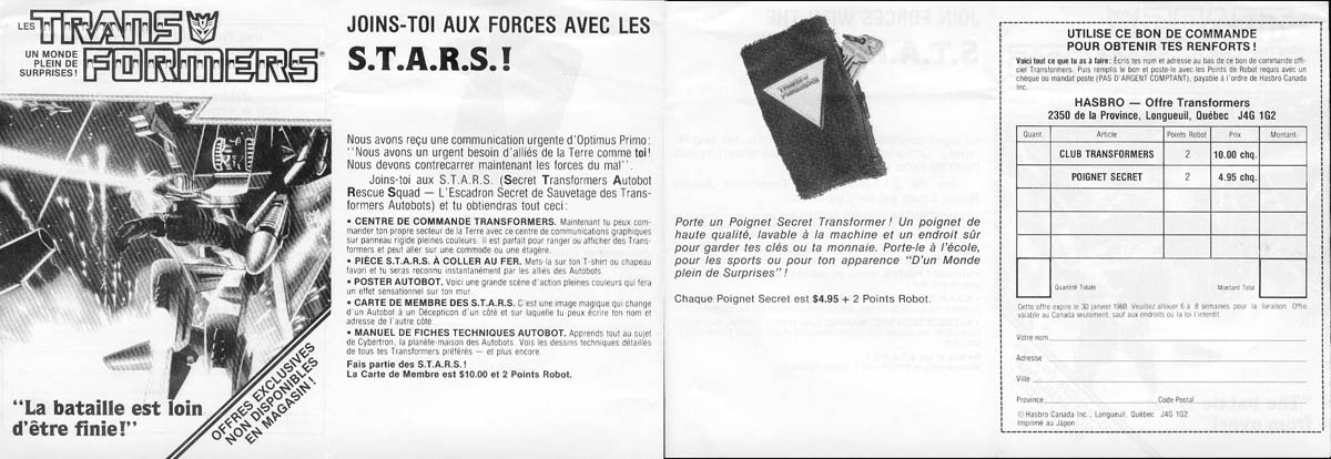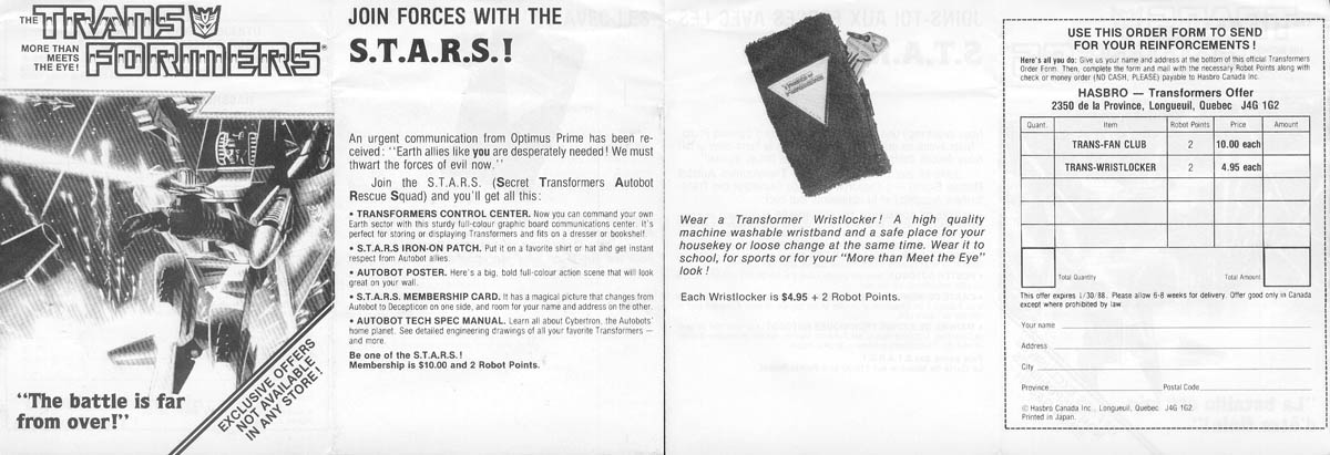 One of the many flyers promoting the S.T.A.R.S. (Secret Transformers Autobot Rescue Squad) TF fan club. The club is basically some TF stuff: STARS iron-on patch, card, poster, tech-sepcs manual, and a "command center" (posterboard thing of some kind). This flyer also sells a "wristlocker" and comes a two-sided flyer... one side in English, one in French. Approximate dimensions are 5-1/2" by 16" when fully opened.