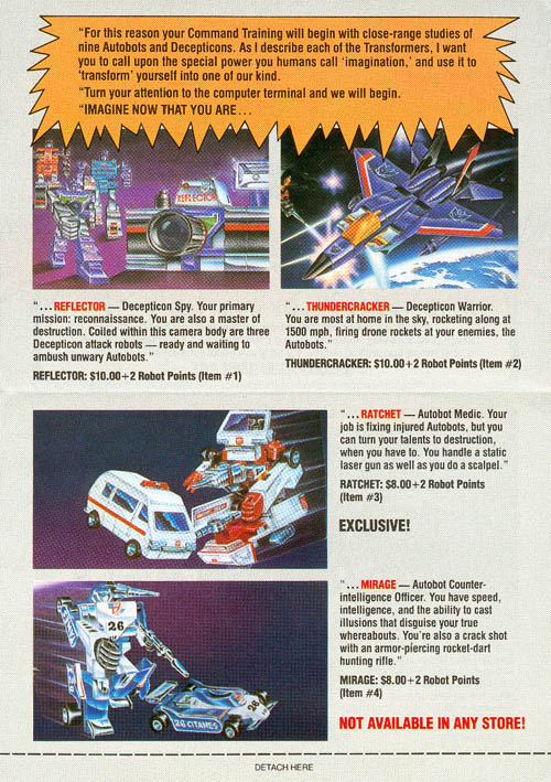 • Page Two (137k) - Inside pages with art and descriptions for Reflector, Thundercracker, Ratchet, and Mirage.
