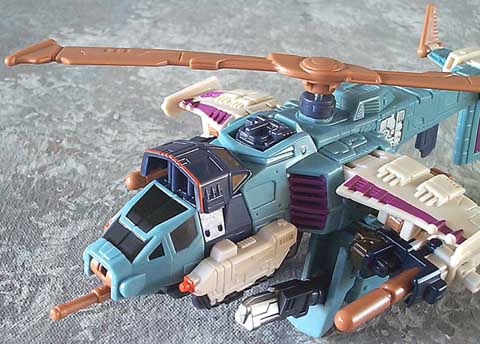Toy Review: Definitely not the Cyclonus many of us know from the original Transformers (Generation One) series. I won't go into the character aspect, but the toy is pretty cool. He's a helicopter and he has a trigger in the back that activates his rotor as well as a mechanism just under his cockpit, and at the front of it. Hooking his Minicon Crumplezone to his front allows the gun turret on Crumplezone to snap back and forth occasionally as the trigger is pulled on. There's a set of Minicons that can also hook up underneath and have their gimmicks activated by Cyclonus' mechanism. He has missile launchers triggered by Minicons on his arms that can be used in helicoptor or robot mode. Fortunately, in robot mode, he folds in half so that his tail hangs down behind him rather than sticking way out the back like Starscream. This gives him a good profile and keeps him stable. His rotor is on his back at shoulder height, and it looks good there. His legs each have a pop up machine gun that you release with a Minicon. He's not super poseable, but at least his arms move fairly well. Crumplezone is a lackluster Minicon. His main purpose, in my eyes, is to make Cyclonus' cockpit look better, by essentially replacing it. His tank mode looks passable, but his robot mode is weak. Don't buy Cyclonus for his Minicon, buy him for him.