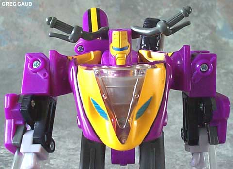 Toy Review: He's a motorcycle. Go get him! ;-) Ok, if that's not good enough, then you might want to pass him up. His bike mode looks great, and his robot mode is good looking, but with legs and arms that don't bend at all, it's hard to give him high marks on playability. His Minicons, Rook and Crosswise are the source of his schizophrenia. When Rook is stuck on his shoulders, Sideways is a Decepticon, revealing a 'con sigil behind the clear section of his chest. With Crosswise in place, the opposite is the case. I love this gimmick, but they heads look REALLY stupid, what with the Minicon's legs sticking up like huge horns. They remind me of the Father Alien in that movie "Explorers" from 1985. Anyway, it looks silly, but I still like the gimmick. Rook and Crosswise also combine to form a larger humanoid robot that can sit on Sideways in cycle mode, which is cool. Rook and Crosswise's individual robot modes are a little goofy looking, and they don't have vehicle modes. But, the lack of vehicle modes is a good thing in this case, as such modes would certainly have just made them worse in their other modes. It's really just the silly looking heads and the lack of poseability that detract from this toy, so don't let those stop you... unless they will. ;-)