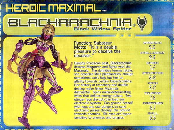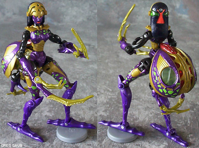 - Probably the better of her two modes, she has barbie-like qualities. Her long legs are twice the length of her torso. Her waist is about the size of her neck, and she has breasts, as all well designed female toys should. ;-) I do have a couple complaints, though, starting with her hands... she has none. Well, she has long claw-like things that serve as legs in beast mode. As spider legs they work, but not as robot arms. They should have made the ends of the legs fold back to reveal small hands or something. Also, the range of movement in her legs leaves something to be desired. Due to their design of separating into two spider legs each, some joints had to be simplified, or left out entirely. Her legs do not rotate anywhere. Simply, her knees hinge, her ankles hinge, and her hips are on limited ball and socket joints. As a result, her legs don't leave much room for posing position, as doing anything other than standing straight causes her to lean to one side, and her waist only spins so you can't straighten her up. On top of all that, she's got a big 'ol butt, made from her spider abdomen.