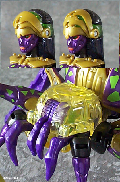 - Mostly purple with some kind of olive-gold color, green accent spots, black parts, and some red accents (like her widow spot, lips and eye shadow). In beast mode, her head is made of translucent olive-gold plastic. Refer to the head shot for a close-up. As far as Beast Machines color schemes go, her's is fairly tame. Her show counterpart isn't as lucky.