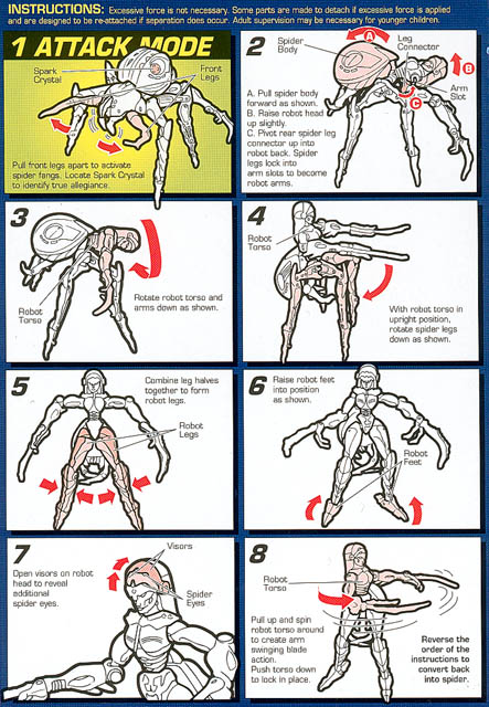 - Move the shell of the abdomen over her spider head to reveal her torso, connect her spider legs into two robot legs, straighten her out, and she's done. If it weren't for the difficulty in connecting, and later separating, her legs, Hasbro's rating of intermediate would be high.