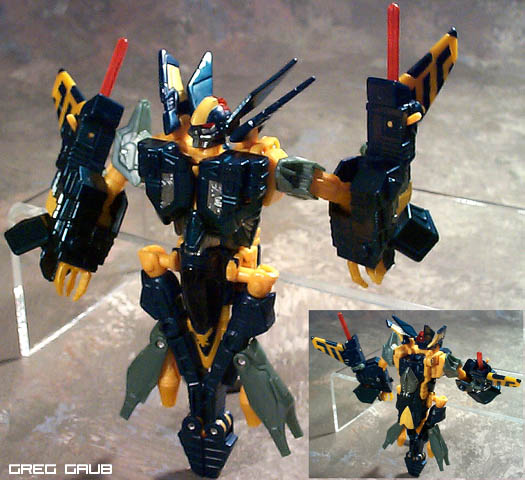 - He's a nice dark-blue, with yellow and red accents. His "energy burst" missiles are translucent red, and he's got some silver/grey bits. Overall, a very nice scheme.