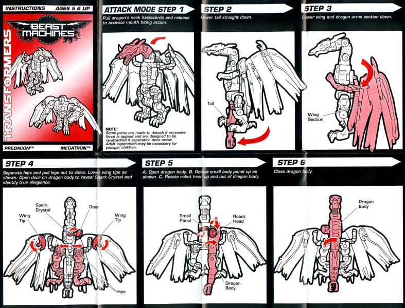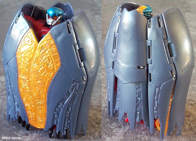 - I have to give them points for this one. It's fairly ingenious... though they all are. ;-) His "wings" come together nicely for the cloak, and his robot/beast conversion is simple but effective.
