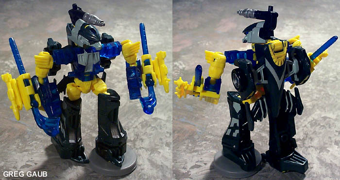 - His exhaust pipes are missiles that shoot with the ball and socket technology of the G2 Cyberjets. His reflected-light "glowing eyes" gimmick doesn't work too good, but it's there. You can also pop the gun off his head and place it in his hand.