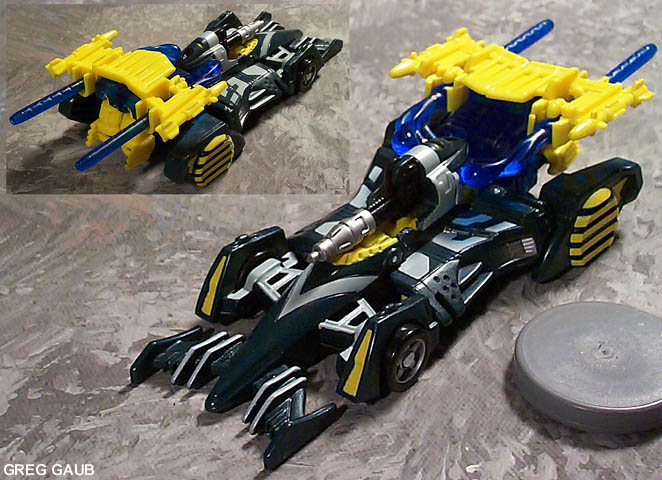 - Billed as an "Indy Race Car" one wonders what a Cybertronian vehicle has to do with the Indianapolis 500? Anyhow, he's a pretty cool, batmobile-esque race car, with huge spoilers and large blue exhaust pipes (which become his missiles). Covered in techno-accents, with a gun in the "cockpit", this one's a winner!