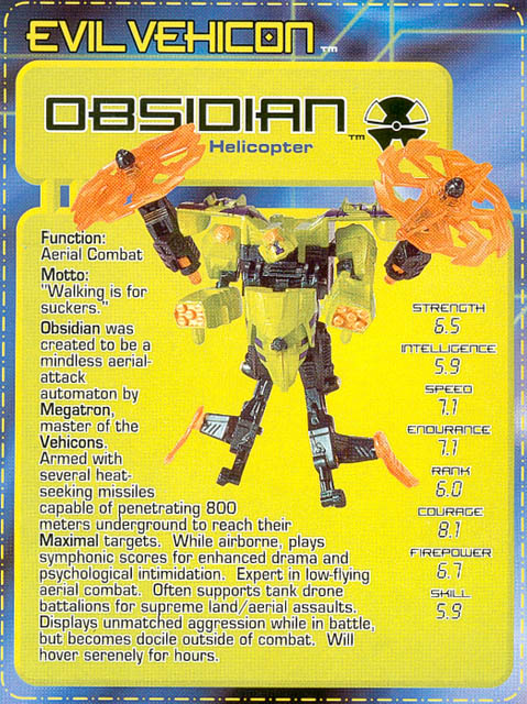 - Very nice combination of light and dark green with some orange paint accents and some translucent orange parts (like the propellers). Very sensible, although disappointing considering his name. Obsidian is a black, semi-precious stone, so a nice black would have been a more fitting choice of color.