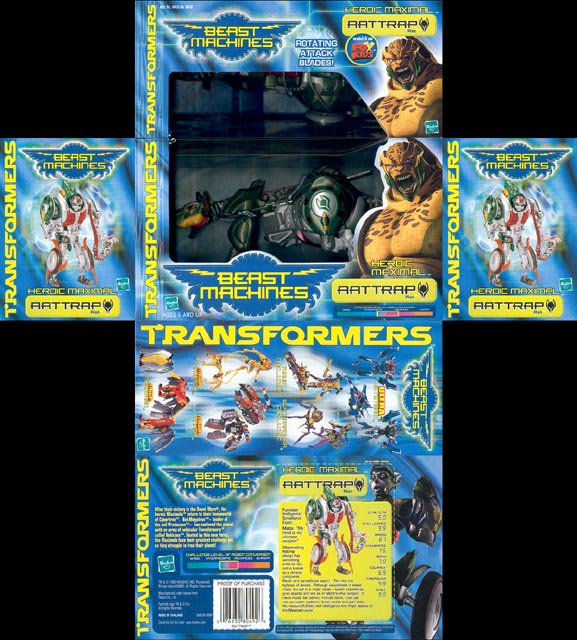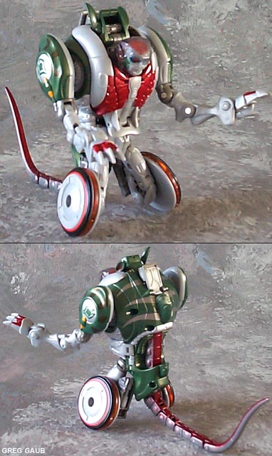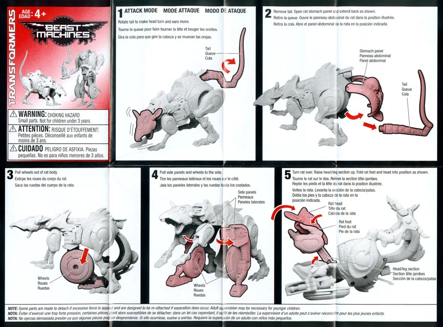 - I think it's a sufficiently complex transformation for a mega sized toy. His legs come out from inside the rat abdomen, and his rat head and front legs tuck into that cavity. The rest is flipping and folding. ;-) I think it's a very well designed transformation, aside from the robot head problem mentioned above.
