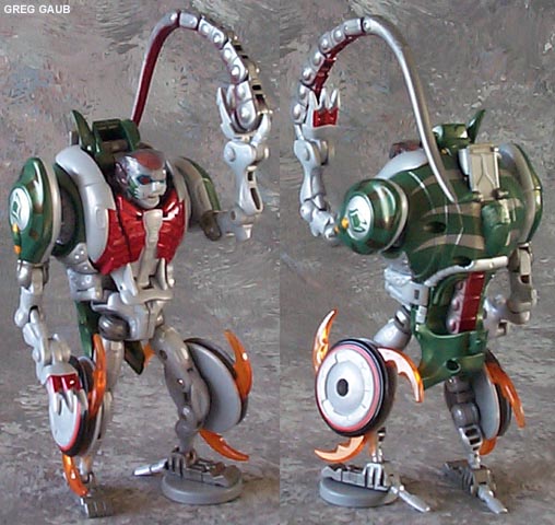 - He can do the wheeled mode like in the show, which some people might prefer to his legged mode. He's essentially the same as in robot mode, but his legs are folded up, and the blade things become wheels. His tail attaches to his butt and provides the third point of support. Not a bad mode, though I think I prefer the legged mode.