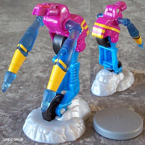 - The chassis is a sky blue, but the main body is fuchsia. He has black wheels, translucent blue arms/tailpipes and yellow accents on the arms and body. Except for the blue chassis, he's fairly close to the show and deluxe Thrust toy. He also has a gray plastic base that looks like peel out/tire smoke which hold him up in robot mode.