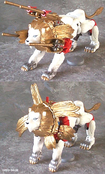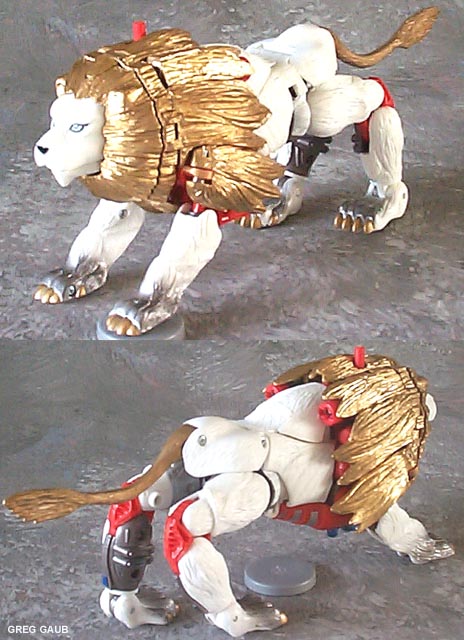 - A very well done lion mode with a big, thick mane. My only complaint is that his front legs are a little weak in that they don't stay were you put them all the time. No other real complaints, though. A very nice toy from Takara.