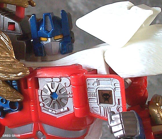 - He's got a bunch. First, his mane. There are three triggers that release hidden missile launchers in his mane. With all four launchers exposed, missiles can be loaded and fired. Fold those bits back, and four other parts out, and the red button on top makes the mane spin around like a saw blade. The Alternate Mode pic shows you how these look. In robot mode, his front lion legs are attached to his forearms, and hide long sword-like claws that flip out when released. He can use them as slashing weapons. Last but not least, he has a panel on his chest that opens up to reveal what looks like a Matrix. Although it doesn't come out, it's a nice added feature which can enhance play value.