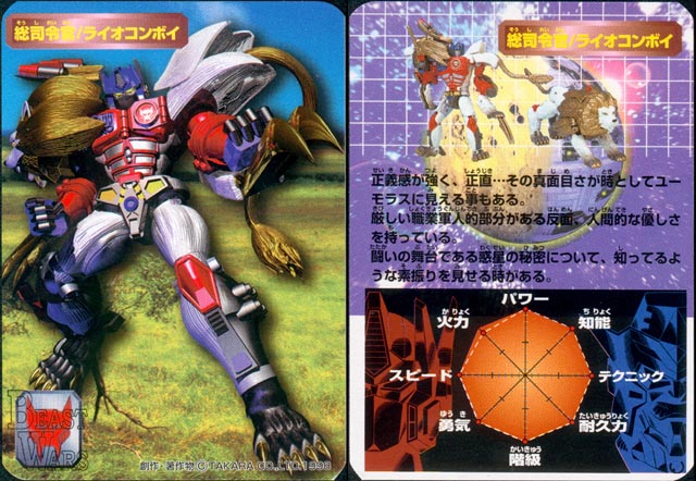 Honest, with a strong sense of right and wrong, though there are times when his seriousness appears humorous. Lio Convoy has a harsh, career-military side to him, but also has a humane gentleness. There are times when he behaves as if he knows something about the secrets of the planet where the battle is taking place.