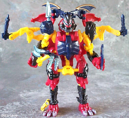 - In robot mode, well... he looks freaky. Freakier, even, than a three-headed dog turned into a robot would be expected to look. His two side dog heads become his robot arms and hands, and the center head transforms a little into the robot head. There are two other robot heads on his main robot head. Actually, they're more like faces on the sides of his head... very much like a Quintesson. His weapons, which are built-in, are blades of varying sorts. His legs are a little wide-stanced for my tastes. I think they could have made them fold in in some fashion. He has a huge torso, and a panel on his chest that opens to reveal... another panel? Yes, just some decoration. The folding panel serves no other functions as far as I can tell. Maybe they were going to cram a gimmick in there but pulled it at the last minute, because he has this very large torso that is completely empty and unused. I wish they had left whatever gimmick in there, because it probably would have made this toy cooler. Anyway, he also has a couple extra arms in this mode, as two of his dog legs fold up against his back, but can also be extended with built-in weapons, and made to be very ominous looking. Check out the photo above of him with four arms. One of the cool things I haven't mentioned yet are his shoulder pads in this mode. One is mostly just a piece of armor, the other has a huge spike sticking straight up out of it next to his head. The shoulder pads both get in the way of the huge ear-like things coming off of his main head, but those are hinged in two places, and can be positioned out of the way as you please.