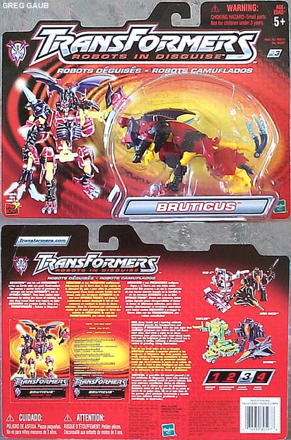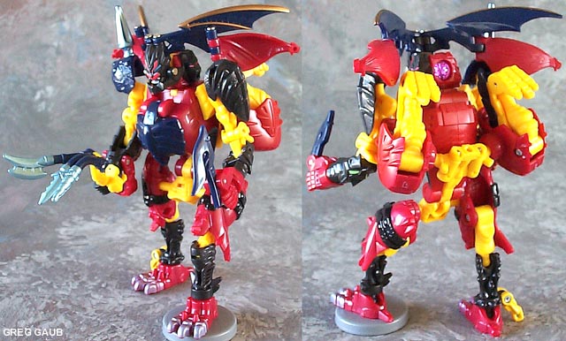 - A three-headed dog. As far as that goes, it's kind of cool. My only complaints about this mode are that the two heads on the sides are barely dog heads. They are much smaller than the middle head, and are almost unrecognizable as dog heads rather than bumps on his shoulders. His middle head also looks almost like a lion, but the long ears that resemble bat wings take care of that right away. As you can see in the photo, his right head has a spinning blade on top... no, it doesn't spin. :\ The "things in threes" that I mentioned above reappears in his tail, which has three ends, each with a different instrument of pain on the end. His tail also serves as a weapon in robot mode.