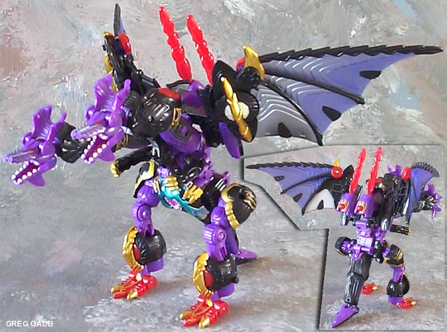 | Added by: Andrew on November 17, 2001 Rated it: Comments: It's not Megatron, but still a worthwhile toy. Best of the Predacon/Decepticon group in RiD, and looks far nicer than the Galvatron (aka Devil Gigatron) recolour. It's great fun playing with all the transformations. Also, the robot mode looks fantastic and is fairly posable, far nicer than the TM2 Megatron dragon. The negative points are the cheap and nasty chrome and the fact that it suffers from Sixshot syndrome, i.e. none of the transformation modes look realistic in the slightest. |